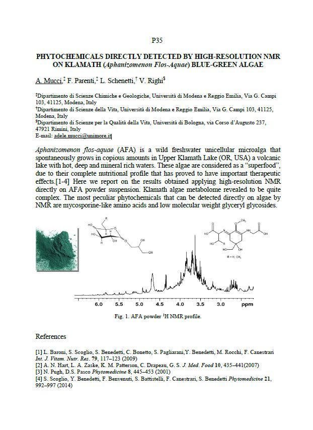 Phytochemicals Directly Detected by High-Resolution NMR on Klamath (Aphanizomenon Flos-Aquae) Blue-Green Algae / Mucci, Adele; Parenti, Francesca; Schenetti, Luisa; Righi, V.. - ELETTRONICO. - unico:(2016), pp. 73-73. ( XLV National Congress on Magnetic Resonance Modena 5-7 settembre 2016).