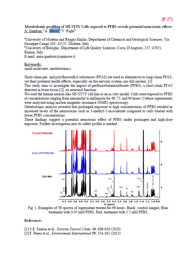 Metabolomic profiling of SH-SY5Y Cells exposed to PFBS reveals potential neurotoxic effects / Gambini, A.; Mucci, A.; Righi, V.. - (2025). ( 52nd NATIONAL CONFERENCE on MAGNETIC RESONANCE Verona 10-12 September 2025).